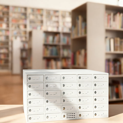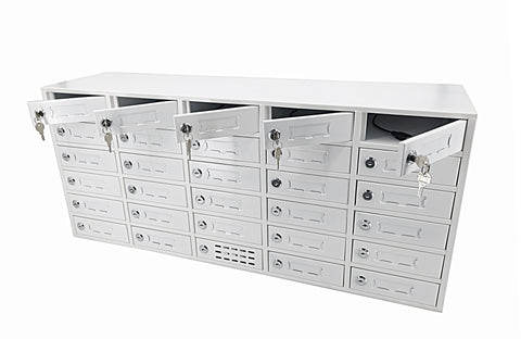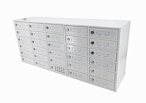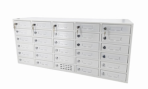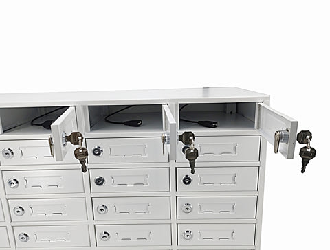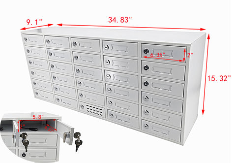 * Constructed entirely of steel metal with white power coating, fully assembled, cell phone lockers can accommodate cell phones, iPads, wallets, keys, cameras, tablet PC's and other small items. Size: 34.8 Wide (Left to Right) X 15.4 High x 8.3 Deep (Front to Back). 30 compartments - one is used for wire management, 30 unique set of keys and locks. Each slot's lock comes with two identical keys. Two master keys are provided. Master keys can access any locker.