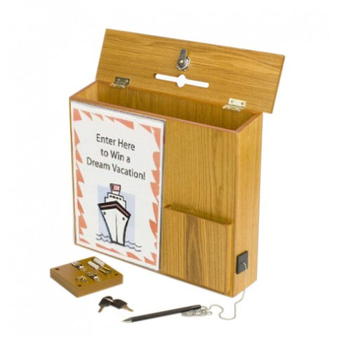 Box,Collection Donation Charity,Suggestion,Fund raising with Acrylic Sign Holder.Medium Oak finish looks great in any location. Side pockets conveniently holds input cards or donation envelopes.Security pen with long chain ensures pen won't be taken.Lock and key is included.Includes 8.5x11graphics holder to advertise your cause/ event. Holder attacheds via double sided foam tape (provided).
