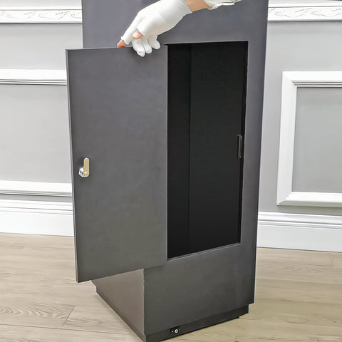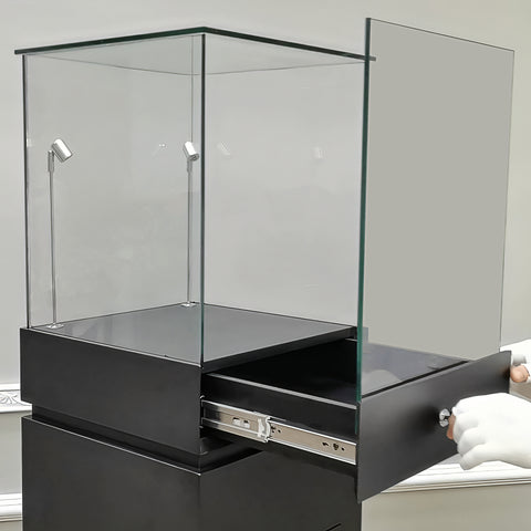 【Tempered Glass Display Case with Secure Storage Cabinet】The top glass box is made of 8mm thick tempered glass and is designed with 2 LED lights to enhance the display. The bottom cabinet is made of 15mm MDF with a black lacquer finish. Both the drawer and door feature locks to securely store items