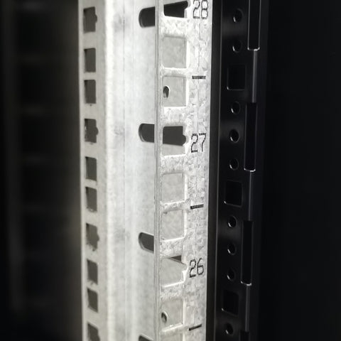 【89.5x23.5x24.5”, Lock with 2 Keys】18.5" Rail Distance. Adjustable mounting rails with easy view depth index and toolless mounting slots for PDUs and vertical cable managers
