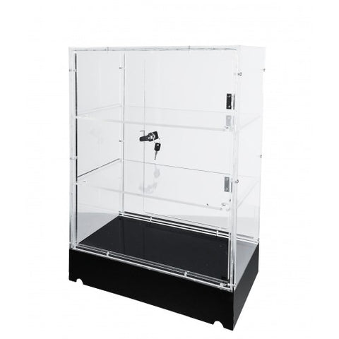 This transparent cabinet is made of high quality 1/8 acrylic. The overall size is 15.75 Wx20.28 Hx7.87 D, with the clear portion being 15.75 Wx17.48 Hx7.87 D, and the black base 15.75 Wx2.8 Hx7.87 D. The packaging box size is 21.7x18x10.2. Gross weight is 8.2 LBS. Door size is 9.7x15.6 with cam lock comes with 2 keys. Multiple units buyers, one key opens all.