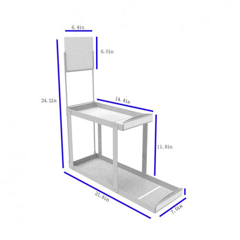 ¡¾Overall Size: 7 X 21.6 X 24 ¡¿The overall dimensions of the metal beverage stand are 7 inches in width, 21.6 inches in depth, and 24 inches in height. It is equipped with two metal shelves. The lower shelf measures 6.7 inches wide, 20.8 inches deep, and has 1-inch tall lips. The top shelf is 6.7 inches wide, 14.2 inches deep, also with 1-inch tall lips. There is a clearance height of 9.8 inches between the two shelves. Each shelf has a sign clip holder suitable for 6.6 x 1.26 inches cards. Additionally, it features a header graphic holder suitable for 6.4 inches wide and 6-8 inches tall cards