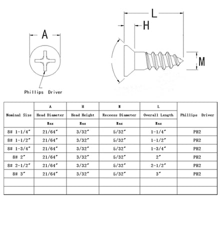 * Counter Sunk head keeps your finished surface smooth. Screw head 21/64" diameter. Recess diameter 3/32". Pitch 1/16". Drive type: PH2