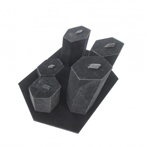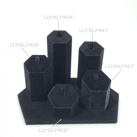 5 Piece Hexagon Ring Display Set is great to display your ring products on countertop. This display comes with a tabletop pad and 5 various sizes. You can configure it in a variety of ways. Platform measures 11x7.2. Tallest ring tower is 5.75 tall. Shortest tower is 1.9 tall. Tower is 2.5 wide.