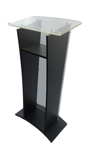 Dark grey finished from melamine MDF with an acrylic front panel and silver accents, this podium looks great on any stage or platform.