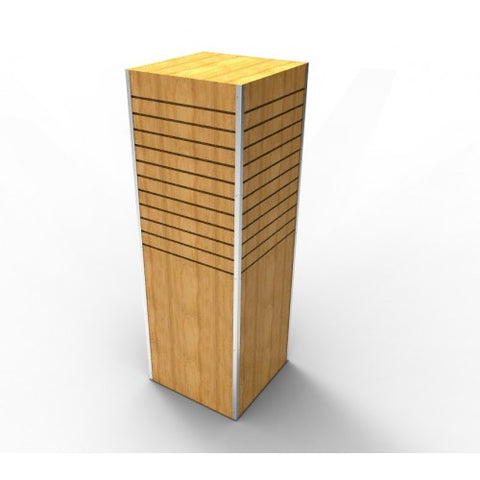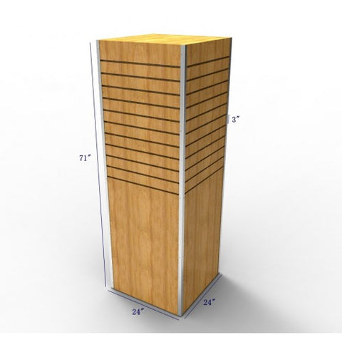 Four sided slatwall display loads a lot of products or information brocures.<br>. Fits most mounting accessories. <br>. Maple melamine finish fits most environments. <br> Display is 71" Tall, each panel is 24" wide. Overal dimensions: 71 x 24 x24". Slatwall starts from the top down for 35". Display designed for easy assembly. Instructions provided. Order from our comprehensive list of slatwall accessories to make this kiosk one of your master pieces in your shop.90Day Lead Time. Contact us if freight is not shown for your location. This may be because its over weight limited to your area. Pleas call 630 296 4190.