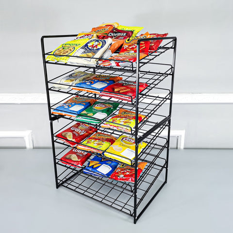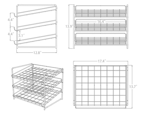 ¡¾17.35 Wide x 12.8 Deep x 14 Tall¡¿3-shelf wire rack works with most tabletop surfaces and pantries. Great for home kitchen, concession stand, food court to display cans, jars, chips, jams, syrup, soup, baby food, beans, vegetables, tomato sauce, beer and soda cans etc. Can also use for literature, magazines or books, even model cars, or greeting cards. Package:17.7 Wide x 14.6 Deep x 2.95 Tall, GW: 6.0 LBS