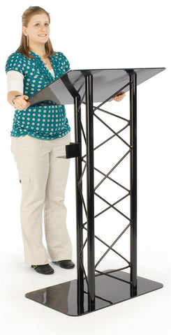 A podium, also known as a presentation lectern or floor lectern, has a powder coated black finish that brings a striking presence to any room it is placed in. A truss lectern, podium has a large top surface area that holds books and lecture notes quite easily. A lip on the bottom of this surface keeps your lecture material from sliding off. This floor lectern, podium uses an exciting design to draw the focus of your audience towards the speaker, ensuring all are paying attention to their presentation.