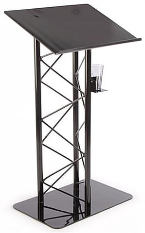 This podium is made from durable aluminum with a steel base and top. This podium features a contemporary truss design. Any conference room or business presentation will look sleeker when the speaker is standing behind this impressive podium. The podium, like a presentation stand, has a cup holder built into the middle of the stand. A cup holder is perfect for holding beverages in your podium relatively out of sight of the audience. A floor lectern is an ideal podium for use in business conference rooms, convention centers, and even school settings.