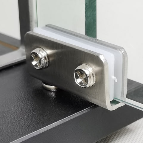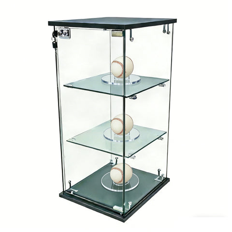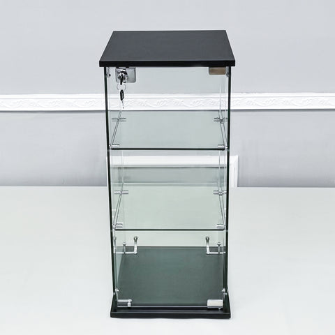 【1/4 Inch (6mm) Glass, Engineered Wood Top & Bottom】This clear tempered glass showcase is made of 0.25 inches (6mm) thick tempered glass and 0.6 inches (15mm) thick black MDF. Easy assembly with screws and metal connectors.