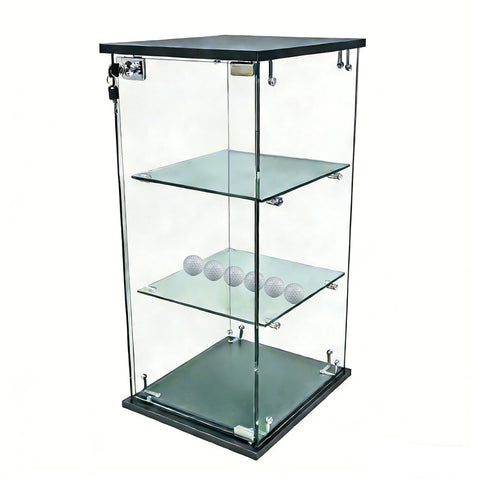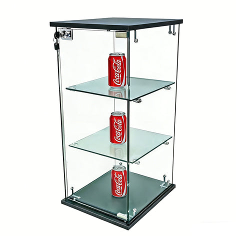 【12.3 X 14.3 X 27"】Overall dimensions are 12.3 inches in width, 14.3 inches in depth and 27 inches in height. This glass showcase features 3 shelves, shelves are removable, positions are fixed. Each shelf is 8.4 inches apart in height, and shelf measures 11 inches in width and 12 inches in depth
