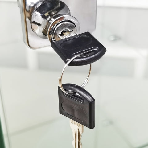 【Comes with Lock and 2 Keys】Multiple units buyers, locks are keyed alike. The base panel bottom has 4 rubber feet for protection from scratch. To order addtional keys, CS at FixtureDisplays calm