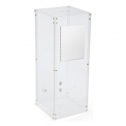 Rear door access. Material: 3/16 (5mm) clear acrylic. Size: 12x12x40. Slot Size: 5.118 long x 7/16 wide (9mm) fits up to #10 envelopes.