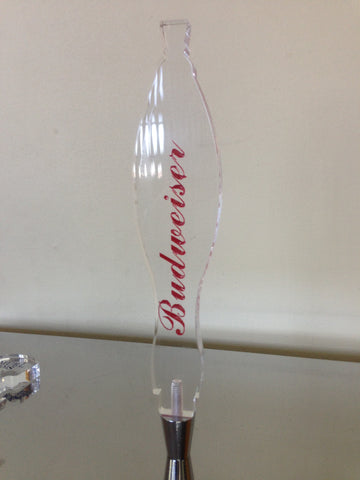 Lovely novelty beer tap handle for Budweiser Brand. Made from 10mm clear plexiglass/acrylic, this handle is lightweight (3 oz), transpararent, and strikingly beautiful. Measures 8.5" tall x 2" wide x 3/4" deep (measures from the thickest point).