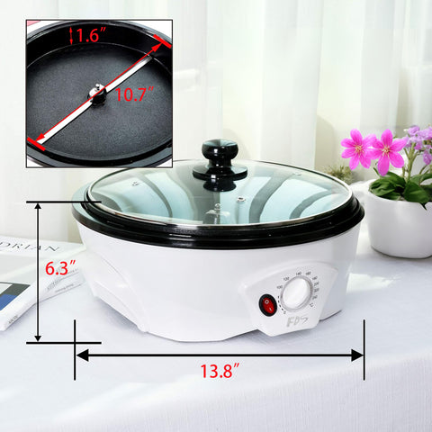 【0.6 - 1.1 Pounds Capacity】The product size is 13.78 inches in length x 13 inches in width x 6.3 inches in height, with a product weight of 5.23 pounds. The inner diameter of the pot is 10.7 inches x 1.57 inches pot depth. The optimal roasting capacity is 350-500g (0.77-1.1 pounds); less than 300g will result in uneven roasting. The maximum roasting amount is 500g (1.1 pounds). The automatic mixing rod drives the beans to rotate and turn at a uniform speed