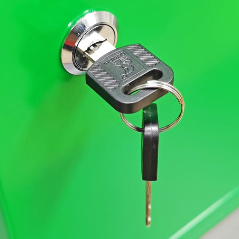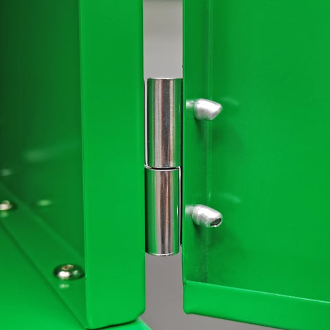 【Steel Construction】Made of 21-gauge (0.8mm) steel with a powder-coated green finish, it features a door with a lock for added security