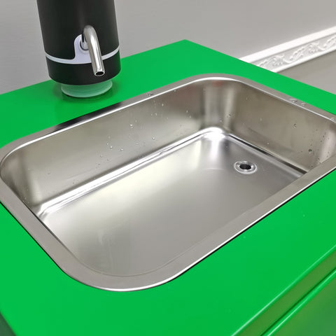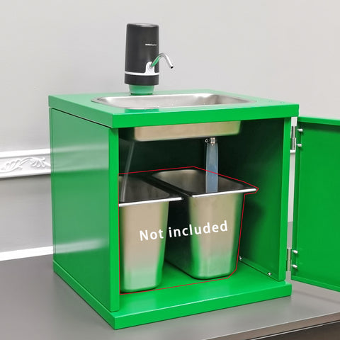 【Portable Mobile Sink with Electric Pump for Home, Outdoor and Food Service Use】This mobile sink is equipped with a battery powered electric pump, making it ideal for both home and business use. It provides a convenient solution for washing hands, vegetables, fruits, and more. The portable design, complete with a water reservoir and drainage system, allows for easy setup anywhere, while the electric pump ensures a steady water flow without connecting to city water supply. Perfect for camping, backyard events, garage, workshop, street vending, food service stands for washing station. The shipping box measures 17.7 inches in width, 16 inches in depth, 6.3 inches in height with a gross weight of 19 pounds