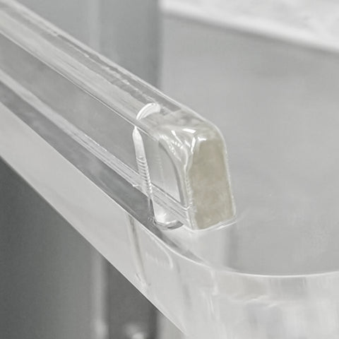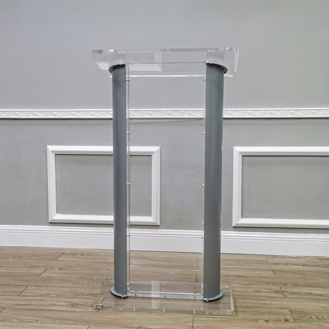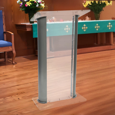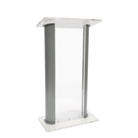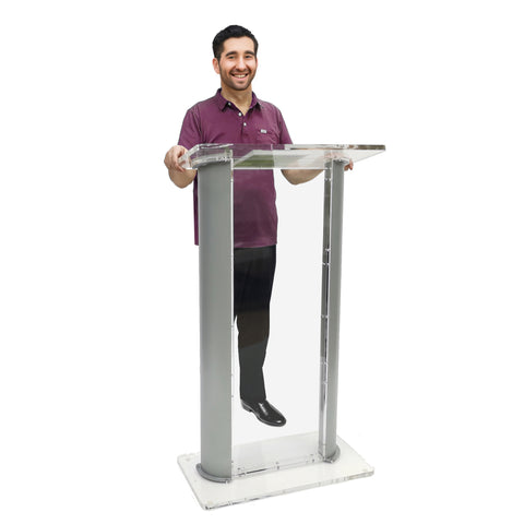 【Durable and Stylish Acrylic Podium with Metal Accents】The podium's top and base panels are made of 0.7" (18mm) clear acrylic, while the front panel is made of 0.4" (10mm) clear acrylic. The two curved poles are constructed from 16GA (1.5mm) metal steel with a powder-coated silver finish