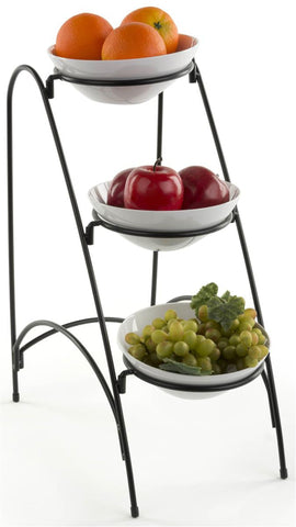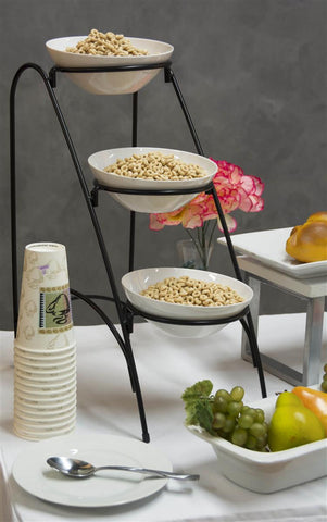 This tiered buffet stand includes three white melamine serving bowls. Save space on a banquet table by stacking condiments, desserts, toppings or other items in this display rack. This tiered buffet stand is made of stylish black wire with a modern curved design. The feet are rubber padded to avoid scratching the surface of the table. A tiered buffet stand is perfect for restaurants, banquets and other catering event. Please Note: This product is not microwave safe.Overall Width x Height x Depth: 9 3/10 x 20 x 14 1/2; Material: Steel Wire, Melamine; Features: Stain Resistant, Dishwasher Safe; Color: White, Black;Weight 7.0lbs; Placement Style Counter / Tabletop; Height x Diameterz: 4 x 8.