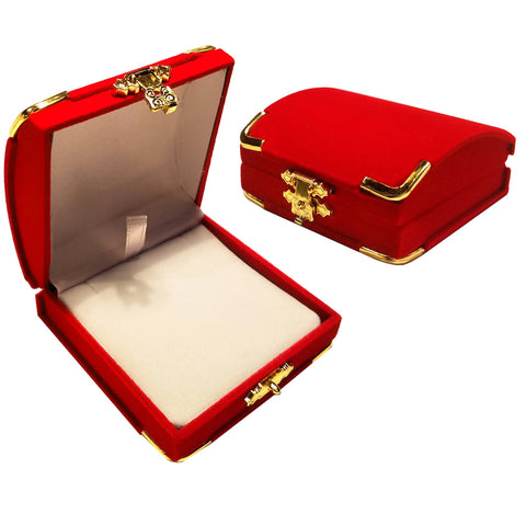 Great Quality Red Velour Treasure Chest Gift Box! * Flocked Plush over Sturdy Extruded Plastic with Gold Accents & Working Latch! * Top is Slightly Domed, Made in 2 pieces & Hinged *