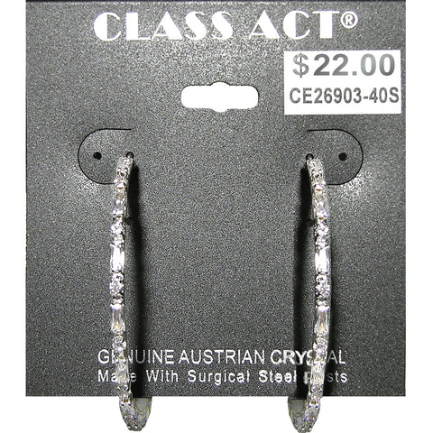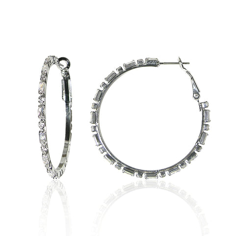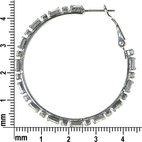Silver Plated 45mm Full Hoop Earrings Made with Sparkly Cubic Zirconia Baguette & Round Shaped Stones * Very Sleek & Unique! * Surgical Steel Posts with Clip Back * Packaged on Our Class Act Earring Card * Lightweight