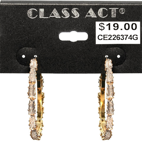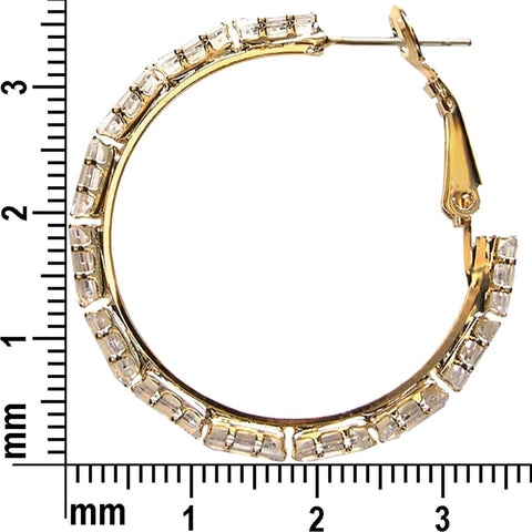 Gold Plated 35mm Full Hoop Earrings Made with Sparkly Cubic Zirconia Baguette Shaped Stones * Very Unique! * Surgical Steel Posts with Clip Back * Packaged on Our Class Act Earring Card * Lightweight *