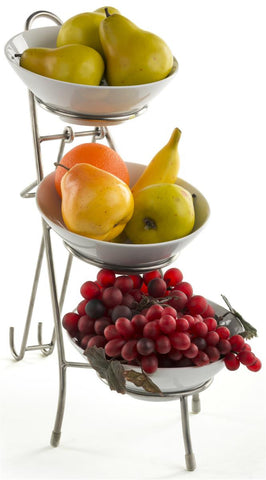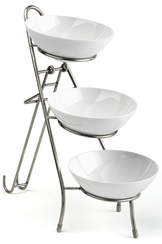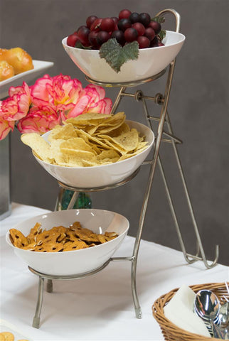 This tiered buffet server is sold with (3) 8-inch-round porcelain bowls that rest atop of the wire display. The dishes are not permanently affixed to the stand, and are therefore incredibly easy to refill and clean. In fact, the porcelain bowls can even be washed in the dishwasher, if desired. This 3-tiered buffet server is made from wire and features a chrome-colored finish for added style. The cascading food service stand offers 4.5 inches of space in-between each level, which makes it easy to set up. It also allows guests full access to the food items on display. This 3-tiered buffet server is perfect for displaying condiments, fresh fruits, salad toppings and much more! Please note that the porcelain bowls cannot be used in a microwave.