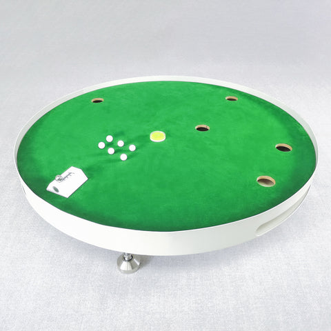 【23 X 23 X 2"】The golf table game platform measures 23 inches in diameter, and 2 inches in height. 3 gravity feed ball access slots measures 8 inches in width and 1 inch in height, allowing for easy retrieval of the golf balls after each round. The playing surface has 6 holes, each with a diameter of 1.2 inches. These holes serve as targets for the golf balls to be aimed at and putt into. The presence of multiple holes adds variety and challenge to the training experience, allowing users to practice their accuracy and precision across different target locations